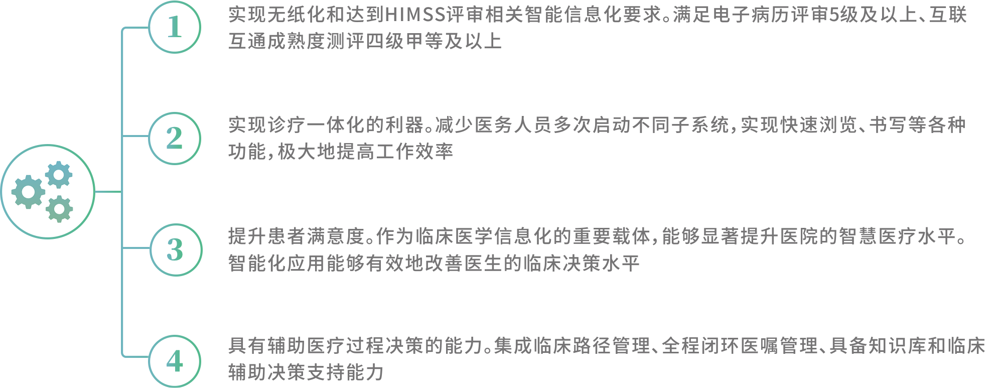 实现诊疗服务环节全覆盖、发挥临床诊疗决策支持、推进系统整合与互联互通;加强诊疗行为监管、加强质量控制与评价、促进线上线下健康服务,促进智慧医院发展。